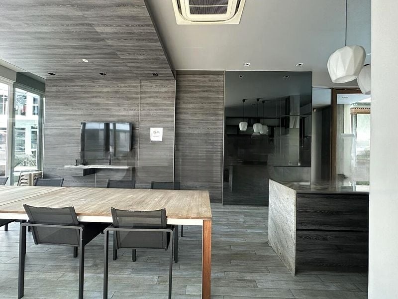 Step into this beautifully maintained 1-bedroom unit at EUHABITAT, where abundant natural light floods the open-concept living area, highlighting the elegant marble-look flooring and modern minimalist ambiance. The glass-enclosed kitchen, complete with integrated appliances and overhead glass shelving, offers a stylish yet functional space for culinary creativity, while large windows frame captivating views of the city skyline and the serene lap pool.