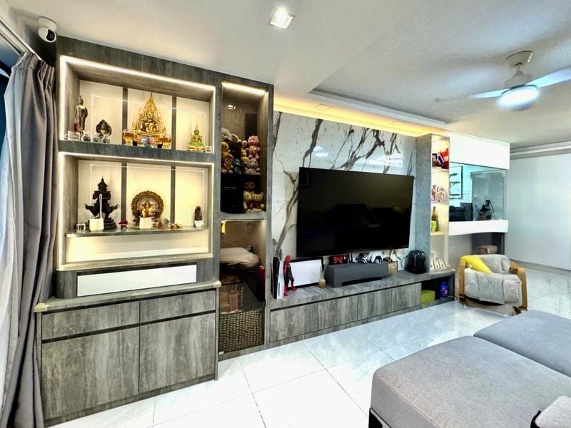 Step into this well-maintained 2-bedroom flat and feel the warmth of a functional, lived-in space. The living area greets you with a cozy ambiance, featuring a massage chair and a decorative window grille that adds character. Natural light may be limited, but the false ceiling with downlights creates an inviting atmosphere, perfect for relaxation.