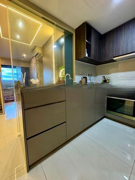 Step into a world of modern luxury as you enter this brand-new designer unit at Riverfront Residences. Bathed in abundant natural light, the living space features a striking marble feature wall with gold inlay, complemented by sleek floating TV consoles and integrated LED lighting strips that create an inviting ambiance. The floor-to-ceiling windows offer breathtaking views of the lush greenery and city skyline, making every moment spent here a visual delight.