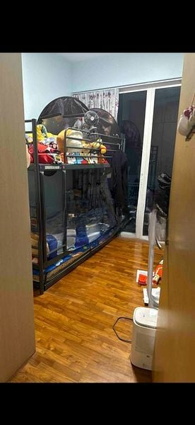 The open-concept kitchen is a chef's delight, equipped with a wooden island dining table, minimalist white cabinetry, and integrated appliances, all thoughtfully designed for efficiency. The master bedroom boasts floor-to-ceiling windows that frame the stunning reservoir view, complemented by a built-in wardrobe and a ceiling fan for comfort. With an efficient layout that includes two bathrooms, a dedicated household shelter, and a yard, every inch of this 786 sqft unit is maximized for modern living.