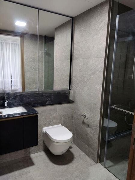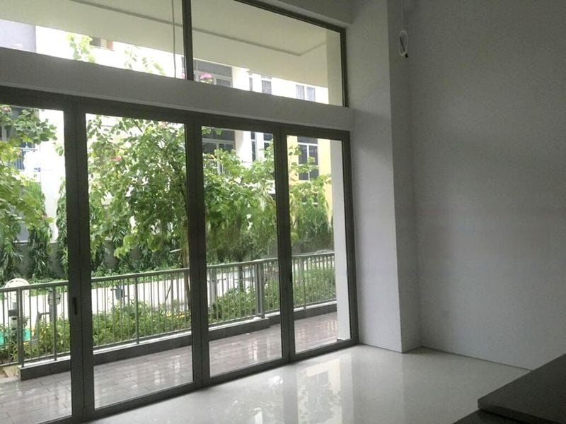Step into a world of modern minimalism where high ceilings soar to an impressive 4.3m, creating an airy ambiance that invites natural light to dance across the marble-look floor tiles. Floor-to-ceiling curtains frame picturesque views of lush greenery, offering a serene backdrop to your daily life.