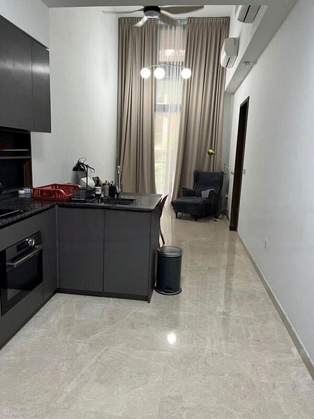 This well-maintained 1-bedroom unit features an open-concept living and dining area, perfect for entertaining or unwinding after a long day. The L-shaped kitchen is a chef's dream, equipped with modern grey cabinetry, black stone countertops, a built-in oven, and an induction hob. The bedroom continues the theme of spaciousness with wood-look flooring and a built-in wardrobe, while the bathroom boasts elegant grey stone-look tiles and a sleek black marble-look vanity.