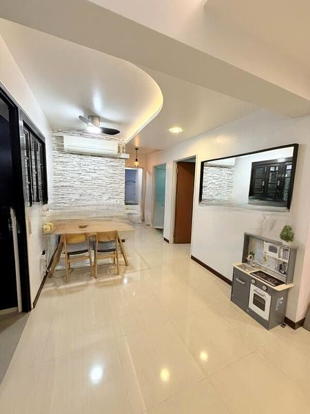 This well-maintained 3-bedroom flat boasts a spacious open-concept layout, featuring a large island kitchen with a stylish wood-look countertop and modern white cabinetry. The master bedroom is a tranquil retreat, adorned with a striking mural and a convenient storage bed frame. The bathrooms are equally impressive, showcasing contemporary finishes with marble-patterned vanities and sleek glass shower screens.