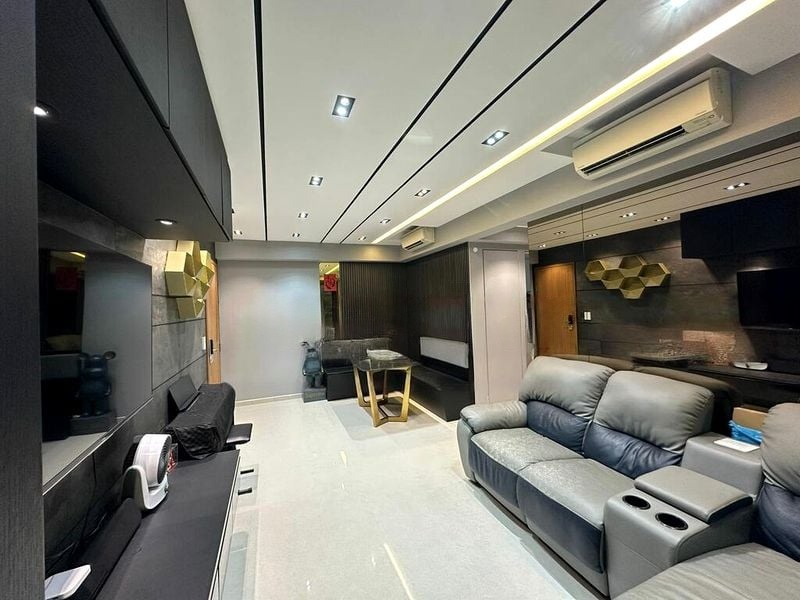 This well-maintained 3-bedroom unit features standout elements such as custom built-in cabinetry, a marble-top dining table with elegant gold legs, and an integrated L-shaped bench seating in the dining area. The galley kitchen is both functional and stylish, boasting light wood lower cabinets, white upper cabinets, and a patterned tile feature wall that adds character. Every detail, from the recessed ceiling lighting to the invisible balcony grilles, has been thoughtfully curated for a sophisticated lifestyle.