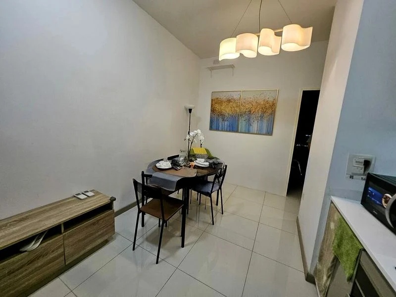 This well-maintained 3-bedroom, 2-bathroom unit features an open layout that seamlessly connects the living room, dining area, and kitchen. The island kitchen boasts high-gloss cabinetry, a built-in oven, and a gas hob, while the marble-top dining table is complemented by sleek black chairs. Enjoy access to the balcony from the living room, where you can unwind and take in the breathtaking views from a high floor.