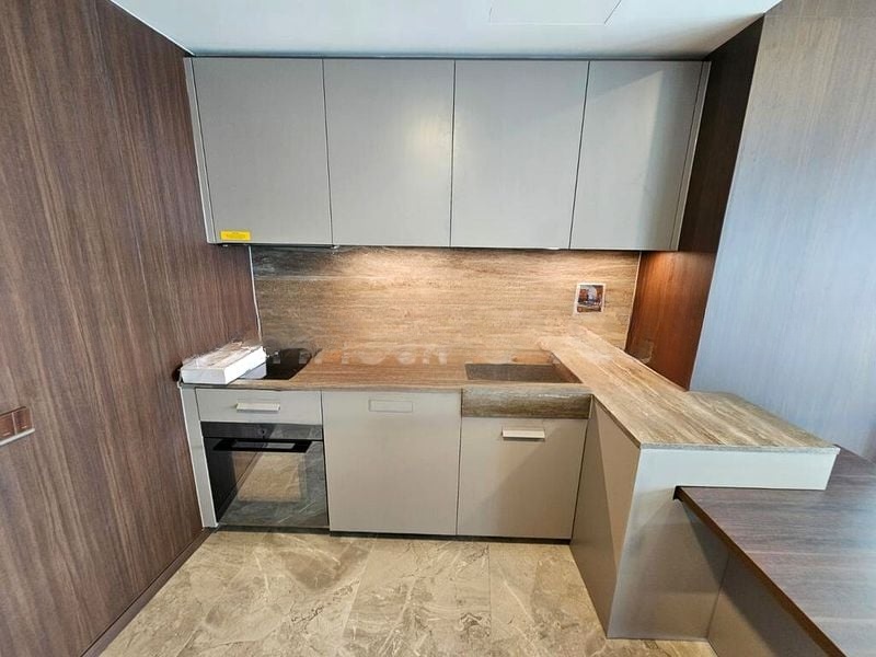 This thoughtfully designed studio features an efficient layout, combining a cozy living/sleeping area with a linear kitchenette equipped with integrated cabinetry and high-end appliances. The bathroom is a sanctuary of luxury, boasting a rain shower, terrazzo finishes, and a spacious mirrored cabinet. Enjoy the convenience of an extendable dining table, perfect for entertaining guests or enjoying intimate meals.