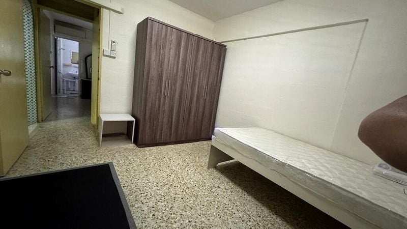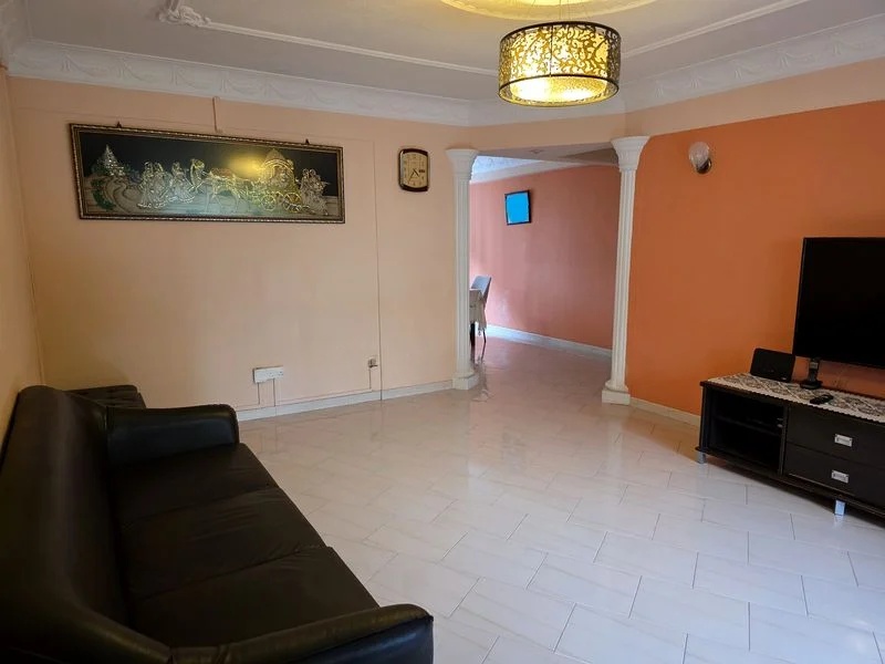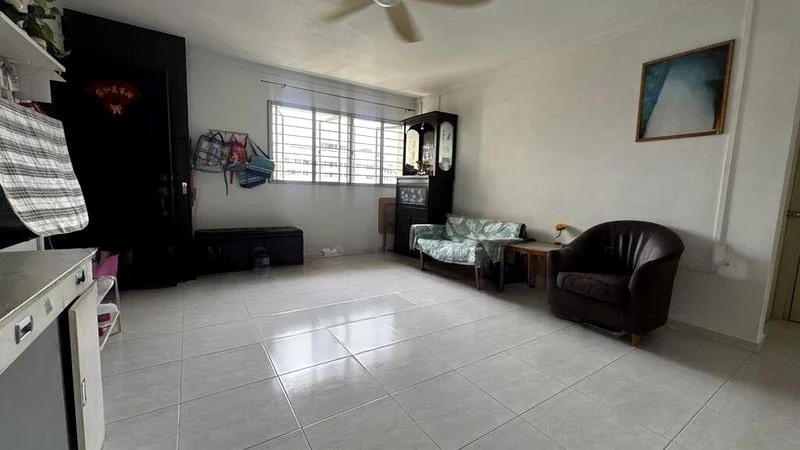 This well-maintained 2-bedroom HDB flat features a spacious galley kitchen layout with a double stainless steel sink and an integrated dining area, perfect for family meals. The living room is adorned with neutral wall tones and a comfortable sofa accented with cushions, while both bedrooms offer built-in storage solutions and dedicated workspaces, catering to modern living needs. The utility area provides practical features like an ironing station and laundry hanging space, enhancing the unit's functionality.