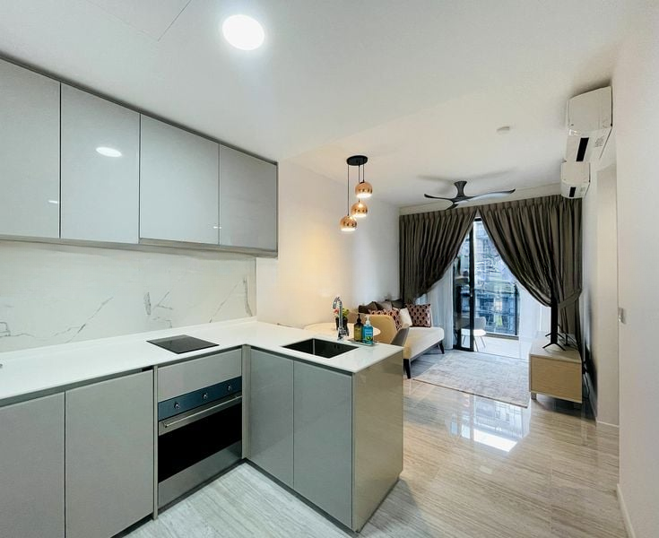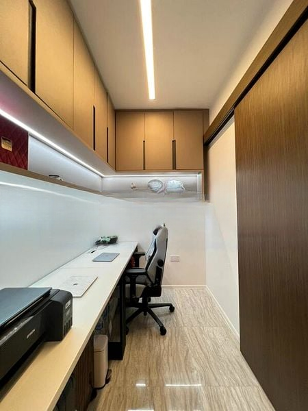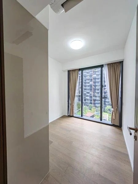 This well-maintained 2-bedroom plus study unit features an efficient layout with a dedicated study room, perfect for a home office. The master bedroom boasts floor-to-ceiling windows and a built-in sliding wardrobe, while the kitchen is equipped with an integrated oven and white cabinetry for a sleek finish. The bathroom showcases elegant marble-look wall tiles and a walk-in shower, enhancing the overall luxurious feel of the home.