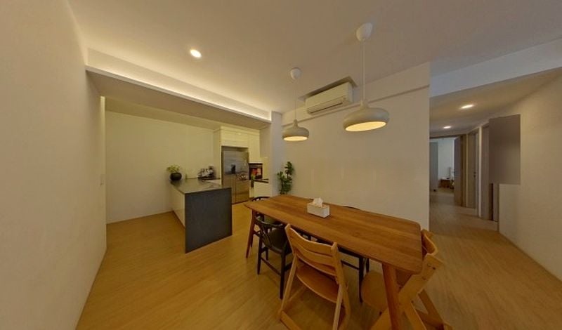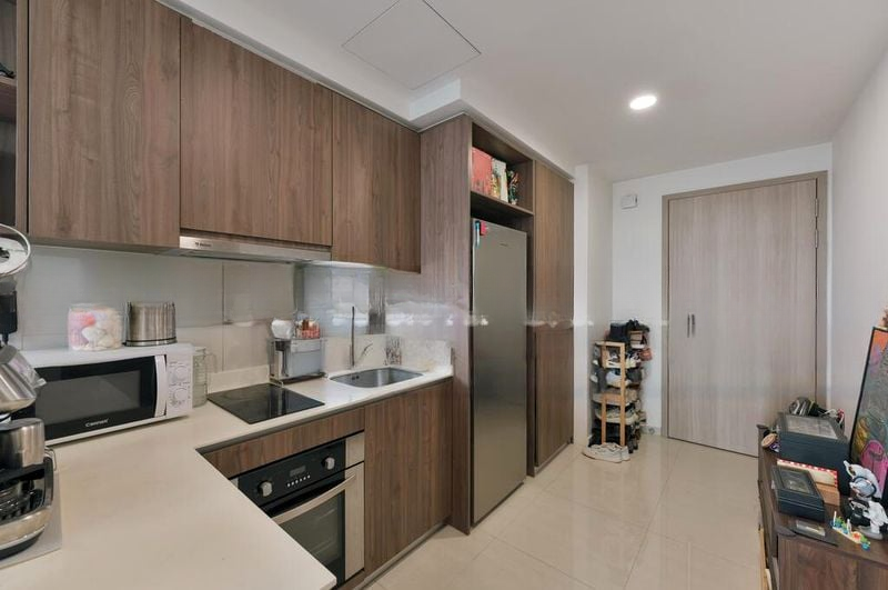 This well-maintained 1-bedroom unit features a thoughtfully designed open concept layout, perfect for both entertaining and everyday living. The kitchen boasts dark wood cabinetry, an island counter, and integrated appliances, while the living area offers a cozy retreat with a patterned rug and wall-mounted air conditioning. The bedroom is a haven of comfort, featuring a platform bed with storage, built-in shelving, and a textured feature wall that adds a touch of elegance.