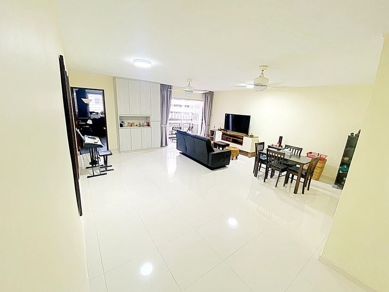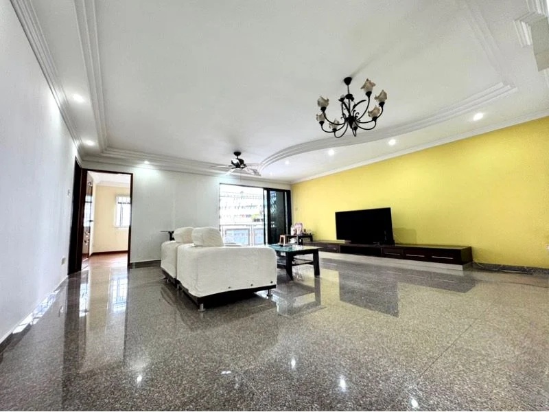 Step into a world of elegance as you enter this well-maintained 3-bedroom HDB unit at 200B Sengkang East Rd. The bright and airy ambiance is enhanced by abundant natural light pouring in, showcasing polished stone flooring and a striking yellow feature wall. The curved false ceiling with recessed lighting adds a modern touch, creating a welcoming atmosphere that invites relaxation and comfort.