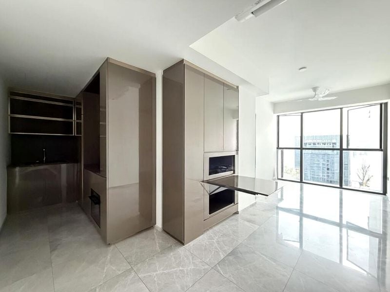The unit boasts standout features including a sleek integrated kitchen with dark wood cabinetry and built-in appliances, a chic living room with sliding glass doors leading to a balcony, and a dedicated study nook equipped with an ergonomic desk and chair. The bathroom is equally impressive, showcasing wall-hung toilets, mirrored cabinets, and marble-look tiles that add a touch of sophistication.