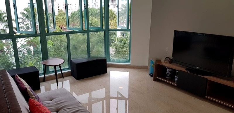 Step into a bright and airy sanctuary at Ballota Park Condominium, where large bay windows invite abundant natural light and frame stunning unblocked views of lush greenery. The marble flooring in the living area enhances the spacious ambiance, making it an ideal space for relaxation and entertaining.