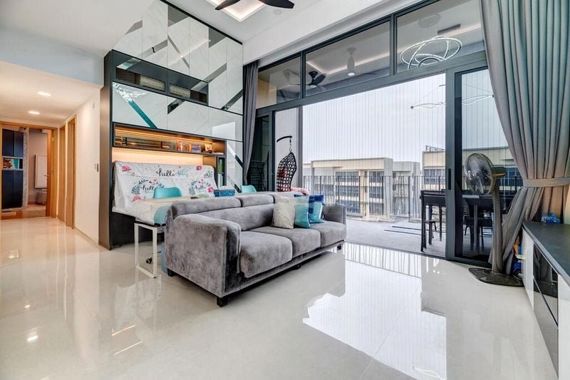 Step into a beautifully maintained unit at Hundred Palms Residences, where modern minimalism meets functional elegance. The moment you enter, you are greeted by the striking geometric patterned sliding door and the soft glow of cove lighting, creating an inviting ambiance. The living room, adorned with hexagonal wall shelves and recessed lighting, offers a perfect blend of style and comfort, enhanced by natural light filtering through large windows.