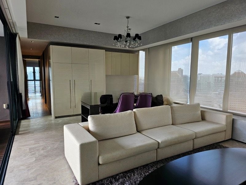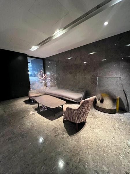 Step into a world of elegance and tranquility as you enter this beautifully renovated unit at OUE Twin Peaks. The abundant natural light floods the space through floor-to-ceiling windows, offering breathtaking panoramic views of the city skyline and lush greenery. The modern minimalist design, complemented by light wood flooring and a textured area rug, creates an inviting ambiance that feels both luxurious and comfortable.
