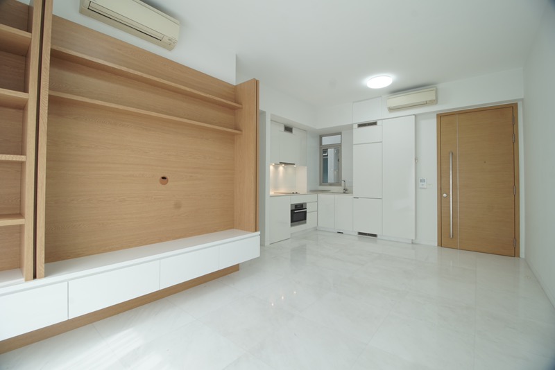 This well-maintained 2-bedroom, 2-bathroom unit boasts a highly efficient layout of 63 sqm (678 sq ft). The master bedroom features luxurious wood flooring and a custom-built padded headboard, while the second bedroom is adorned with full-height wardrobes and tasteful wood paneling. The L-shaped kitchen, equipped with integrated appliances and minimalist cabinetry, is a culinary delight, seamlessly connecting to the living and dining areas.
