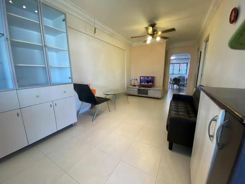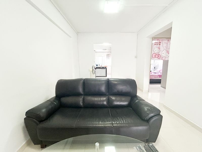 Step into a well-maintained 2-bedroom flat where simplicity meets functionality. The living room greets you with a black leather sofa and a glass coffee table, set against a backdrop of white walls that enhance the natural light filtering through the windows. Enjoy the cozy ambiance as you take in views of the neighboring buildings, creating a sense of community.