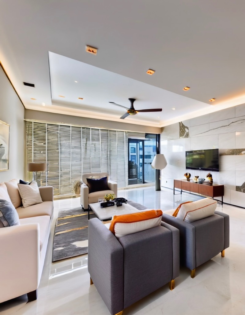 Step into a world of tranquility and elegance at The Jovell, where abundant natural light floods the spacious living area, accentuating the modern finishes and resort-style ambiance. The floor-to-ceiling windows offer breathtaking views of the lush greenery, landscaped gardens, and the shimmering city skyline, creating a serene retreat right at home.