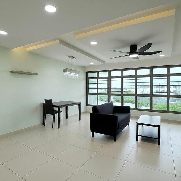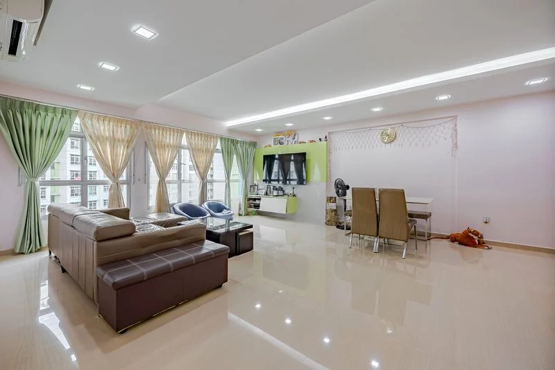 Step into a bright and airy sanctuary at 782A Woodlands Crescent, where abundant natural light dances through large windows, illuminating the polished tile flooring and enhancing the spacious living area. The inviting ambiance is complemented by a stylish L-shaped leather sofa and a built-in TV feature wall, creating a perfect space for relaxation and entertainment.