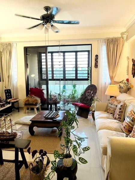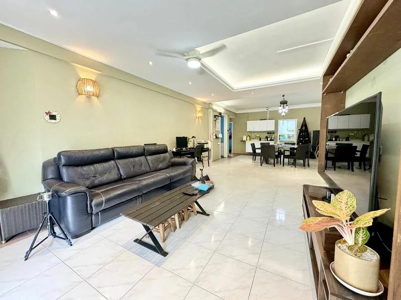 Step into a bright and airy sanctuary at Kensington Park Condominium, where abundant natural light floods the open-plan living and dining area, accentuated by elegant cove lighting and a stylish ceiling fan. The large format floor tiles create a seamless flow, while the lush greenery visible from the extensive outdoor wooden deck invites tranquility into your home.