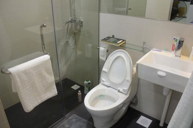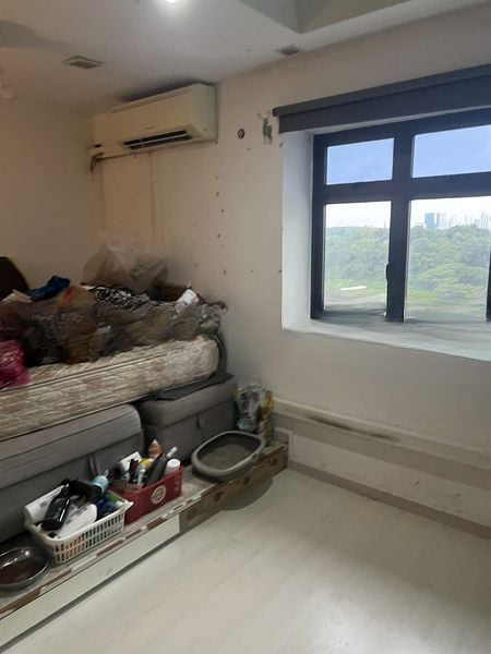 Step into this inviting 2-bedroom flat, where the soft pink feature walls and bright white tiled flooring create a warm and welcoming ambiance. Natural light filters through the window with black grilles, offering a glimpse of the vibrant cityscape beyond, making every moment spent here feel special.