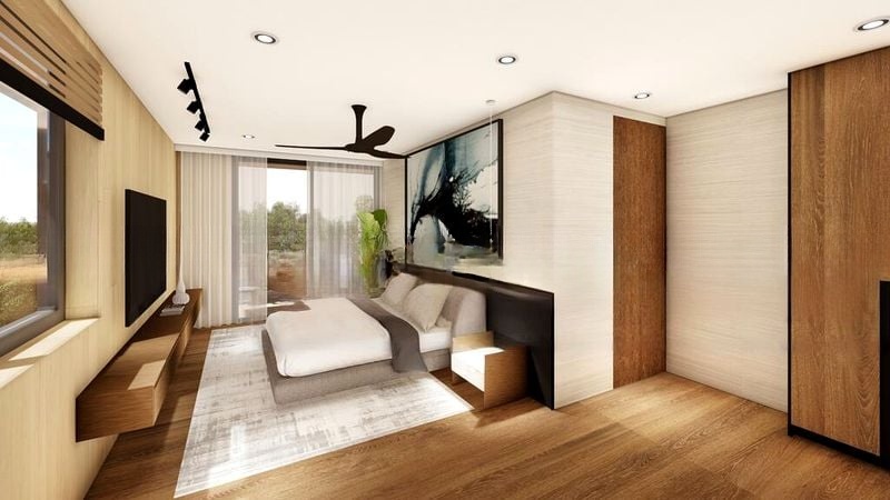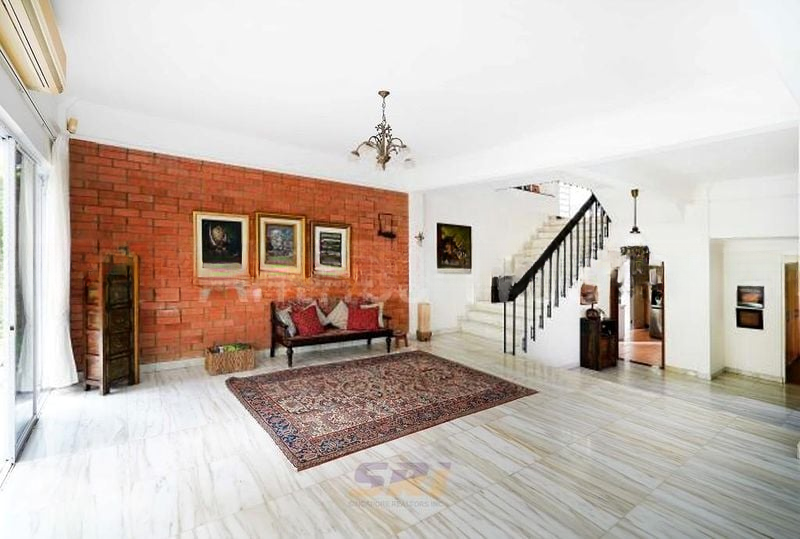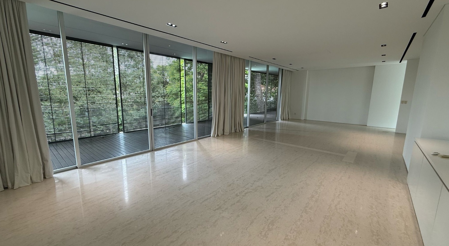 This stunning unit features six spacious bedrooms, each adorned with marble flooring and expansive windows that frame serene greenery. The luxurious bathrooms boast a cylindrical stone pedestal sink, rain shower, and elegant marble finishes, while the architectural black spiral staircase leads you to a zen pebble garden, enhancing the overall ambiance of sophistication and serenity.