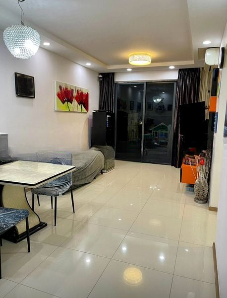 Step into a sanctuary of modern elegance at Blossom Residences, where polished tile flooring and a stunning built-in designer TV console greet you. The living room, bathed in natural light, features a false ceiling with recessed downlights and sliding glass doors that open to a balcony, offering serene views of the infinity-edge swimming pool and lush greenery.