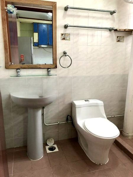 Step into a bright and airy living space where modern comfort meets serene views. The well-maintained unit features a stylish tan leather sofa under a false ceiling adorned with cove lighting, creating an inviting ambiance. Natural light filters through, illuminating the white tiled flooring and enhancing the sense of space, while views of lush greenery and neighboring residential blocks provide a tranquil backdrop.