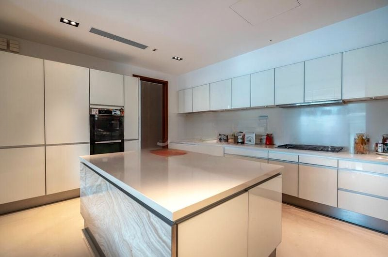 This spacious 4-bedroom condominium features an open-concept living area, a large kitchen island with a stone countertop, and minimalist white cabinetry that seamlessly blends style and functionality. The master suite boasts a walk-in closet with custom shelving and a marble-finished bathroom, complete with a luxurious bathtub and glass shower enclosure. Each room is thoughtfully designed, highlighted by designer pendant lighting and a massage chair in the bedroom, ensuring comfort and elegance at every turn.