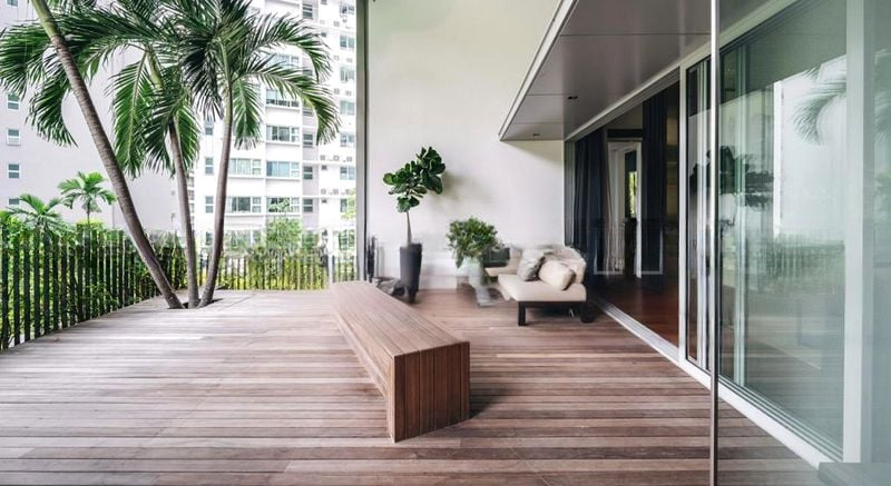 This exquisite unit boasts a seamless open-concept layout, featuring a spacious living room adorned with designer chandeliers and a striking marble feature wall. The island kitchen is a chef's dream, equipped with minimalist dark cabinetry and a sleek white countertop, while the large wooden deck balcony offers an inviting outdoor seating area surrounded by palm trees. The master bedroom provides a luxurious retreat with a padded feature headboard and a walk-in wardrobe corridor, complemented by four additional well-appointed bedrooms and a dedicated study.
