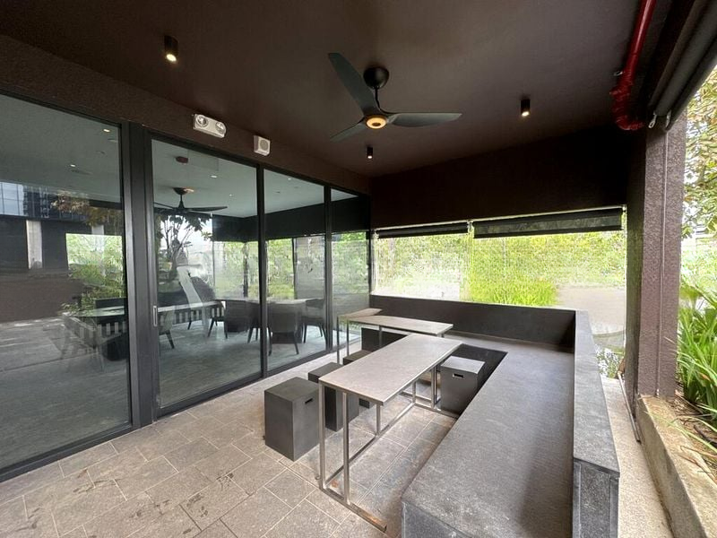 Step into a world of modern sophistication as you enter this beautifully designed 1-bedroom unit at Midtown Modern. The dark wood wall paneling and integrated LED lighting create a warm ambiance, while the large windows invite natural light and offer serene views of lush greenery, making every moment spent here a delight.