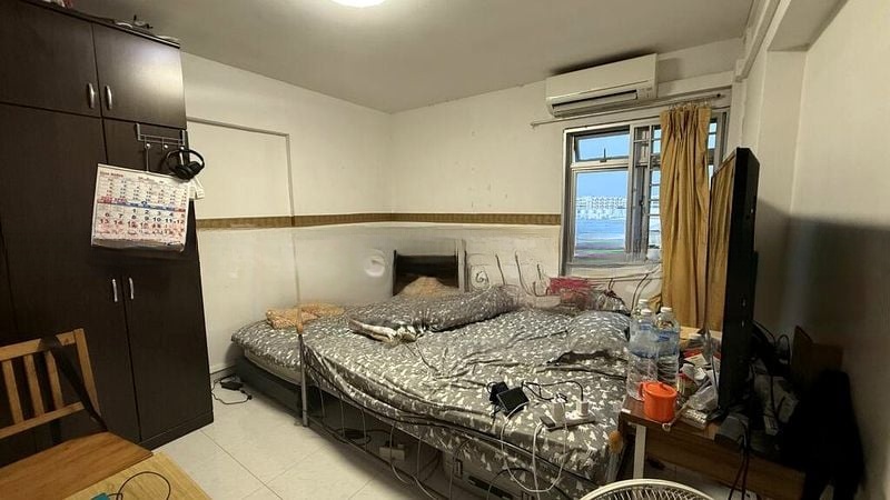 This unit features a well-thought-out layout with a double bed in the master bedroom, complemented by a full-height dark wood wardrobe. The second bedroom is perfect for children or guests, equipped with twin beds and a study area. The dining area flows seamlessly into the kitchen, while the bathroom boasts practical amenities like an instant water heater and two-tone wall tiling, ensuring comfort and convenience.