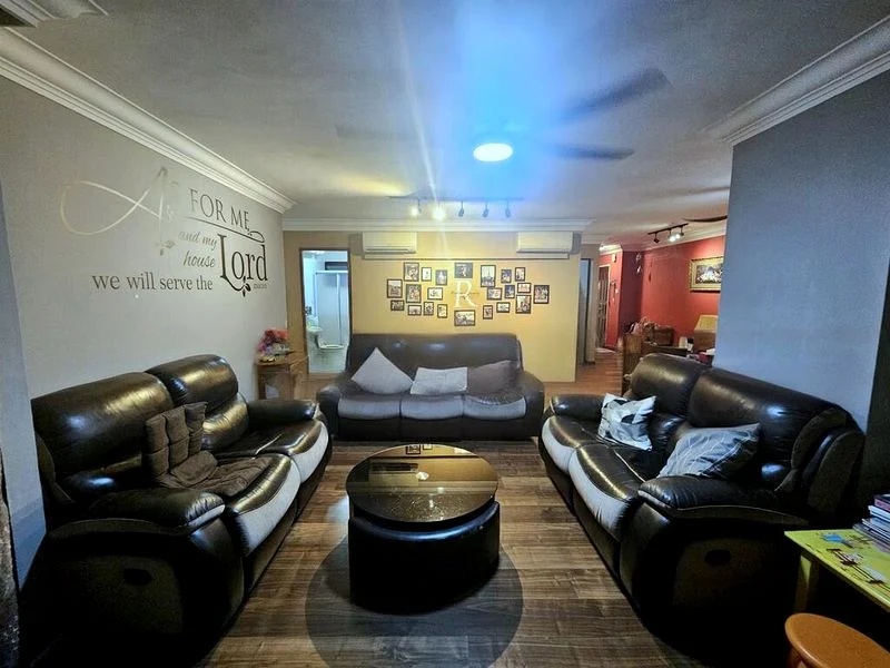 This well-maintained 3-bedroom flat features an efficient point block layout, maximizing space with a spacious living and dining area perfect for family gatherings. The galley kitchen, equipped with white cabinetry and a gas hob, seamlessly connects to a dedicated service yard, ensuring convenience for daily chores. Each bedroom boasts wood flooring and built-in storage solutions, creating a harmonious blend of comfort and practicality.