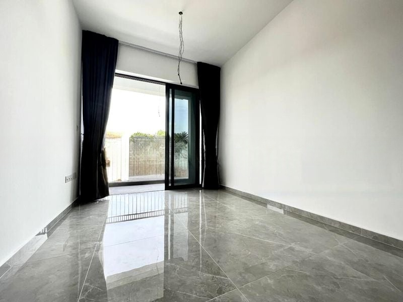 Step into a world of elegance as you enter this brand-new 1-bedroom unit at Mayfair Gardens. The abundant natural light floods through the sliding glass doors, illuminating the sleek grey marble-look floor tiles that extend throughout the living space. With a high ceiling and a seamless connection to the balcony, you’ll feel an immediate sense of openness and tranquility, enhanced by views of the lush greenery and inviting pool.