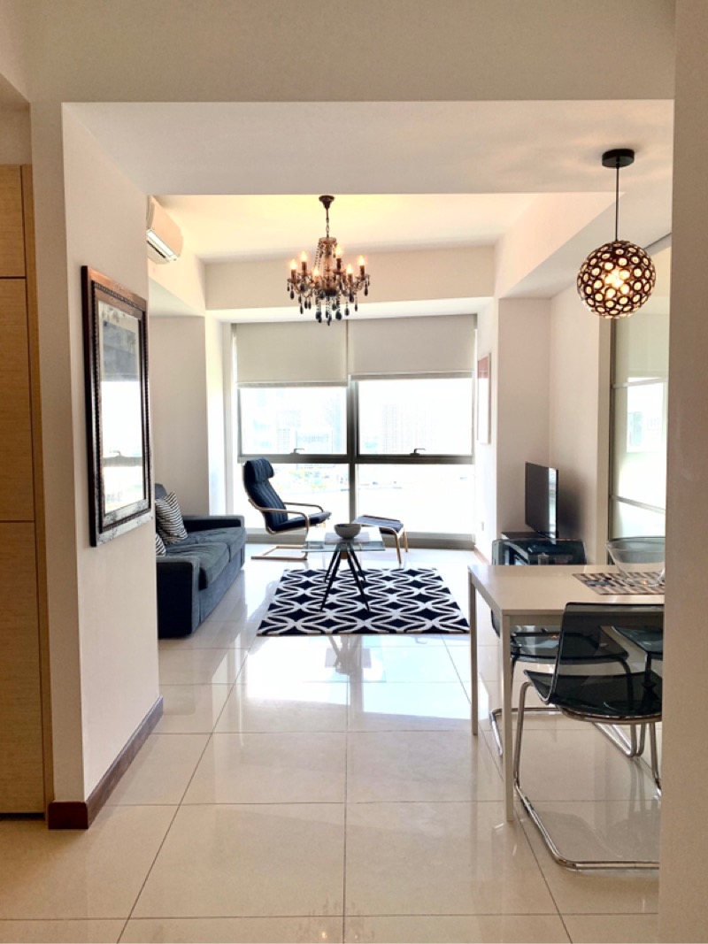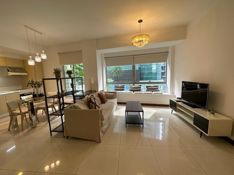 Step into a world of modern elegance as you enter this beautifully renovated unit at Marina One Residences. Bathed in abundant natural light, the open-concept living room features floor-to-ceiling windows that frame breathtaking city views, complemented by chic marble-look tile flooring and a striking geometric ceiling light that enhances the contemporary ambiance.