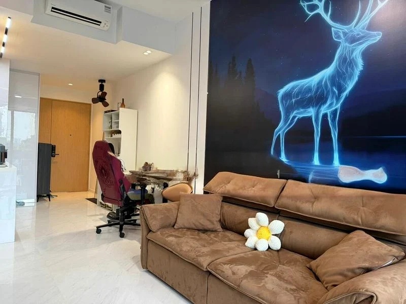 This well-maintained unit features a thoughtfully designed layout with standout elements including a fully-furnished living area, a chic kitchen with wood-grain cabinetry and white quartz countertops, and a cozy gaming/study nook. The bedroom showcases a whimsical fennec fox wall mural and built-in wardrobes, while the modern bathroom boasts under-cabinet lighting and a floating toilet for a touch of luxury. The balcony, equipped with high-top seating, is ideal for enjoying the urban landscape.