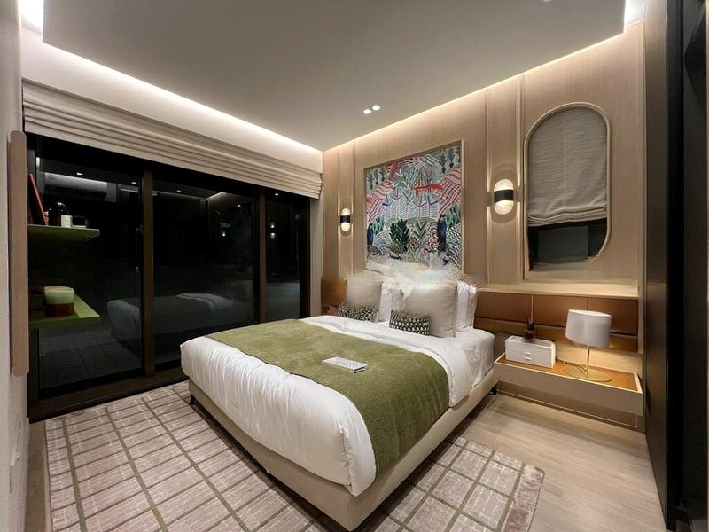 The open-concept layout seamlessly connects the living and dining areas, featuring a spacious L-shaped sofa and a stylish 4-seater dining set. Each bedroom is thoughtfully designed, with the master bedroom boasting a king-sized platform bed and a refreshing view of greenery. Enjoy the convenience of fully furnished spaces, complete with indoor potted plants and vintage-style wall art that adds character to your living experience.