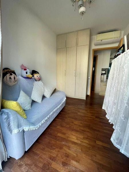 This well-maintained 2-bedroom, 2-bathroom unit boasts an open-concept layout that seamlessly connects the living and dining areas. The master bedroom features elegant wooden flooring and a large window that frames the tranquil views, complemented by another ornate chandelier. The modern bathroom showcases a walk-in shower with glass partitions, while the common bedroom is equipped with a built-in wardrobe and a versatile sofa bed, perfect for guests.