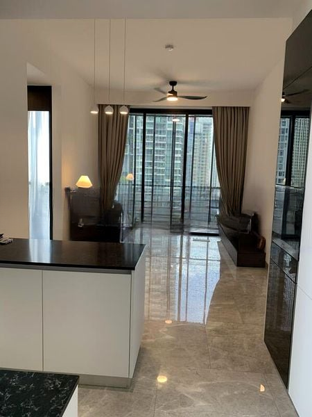 This efficient 2-bedroom plus study layout features a master bedroom with an en-suite bathroom, a second bedroom, and a dedicated study room perfect for remote work or study. The heart of the home is the modern kitchen, equipped with an island counter, sleek white cabinetry, and dark stone-look countertops, ideal for culinary enthusiasts. The living area seamlessly integrates with the kitchen and opens onto a private balcony, where you can unwind while soaking in the urban landscape.