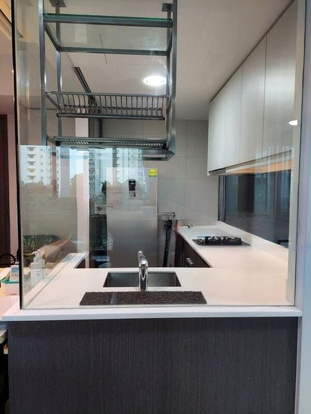 This well-maintained 2-bedroom, 2-bathroom unit boasts standout features such as a stylish glass partition in the kitchen, white quartz countertops, and built-in wardrobes that maximize space. The master bedroom offers a serene retreat with large windows adorned with sheer curtains, while the living room provides direct access to a balcony, perfect for enjoying the evening breeze. The bathrooms are elegantly designed with dark marble-look wall tiles and a walk-in shower, ensuring a touch of luxury in your daily routine.