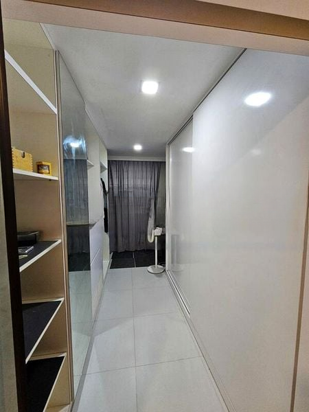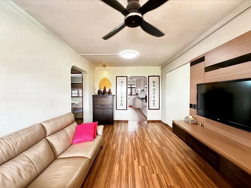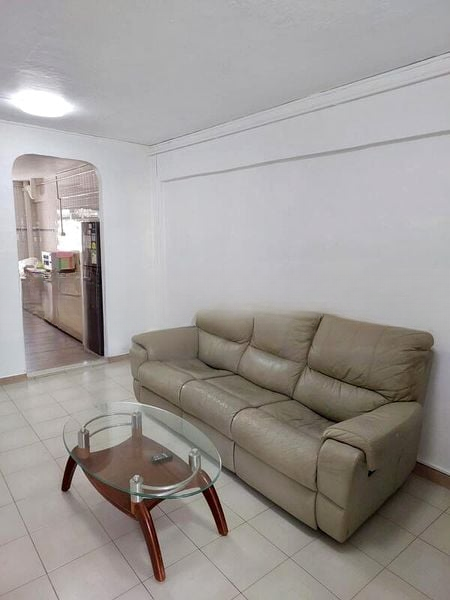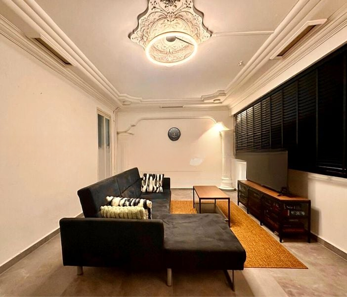 Step into a beautifully renovated 3-bedroom flat that exudes modern minimalist charm. As you walk through the arched doorway, you are greeted by an inviting living room adorned with decorative ceiling molding and bathed in natural light from the black window shutters. The sleek tiled flooring complements the contemporary ambiance, making it a perfect space for relaxation and entertainment.