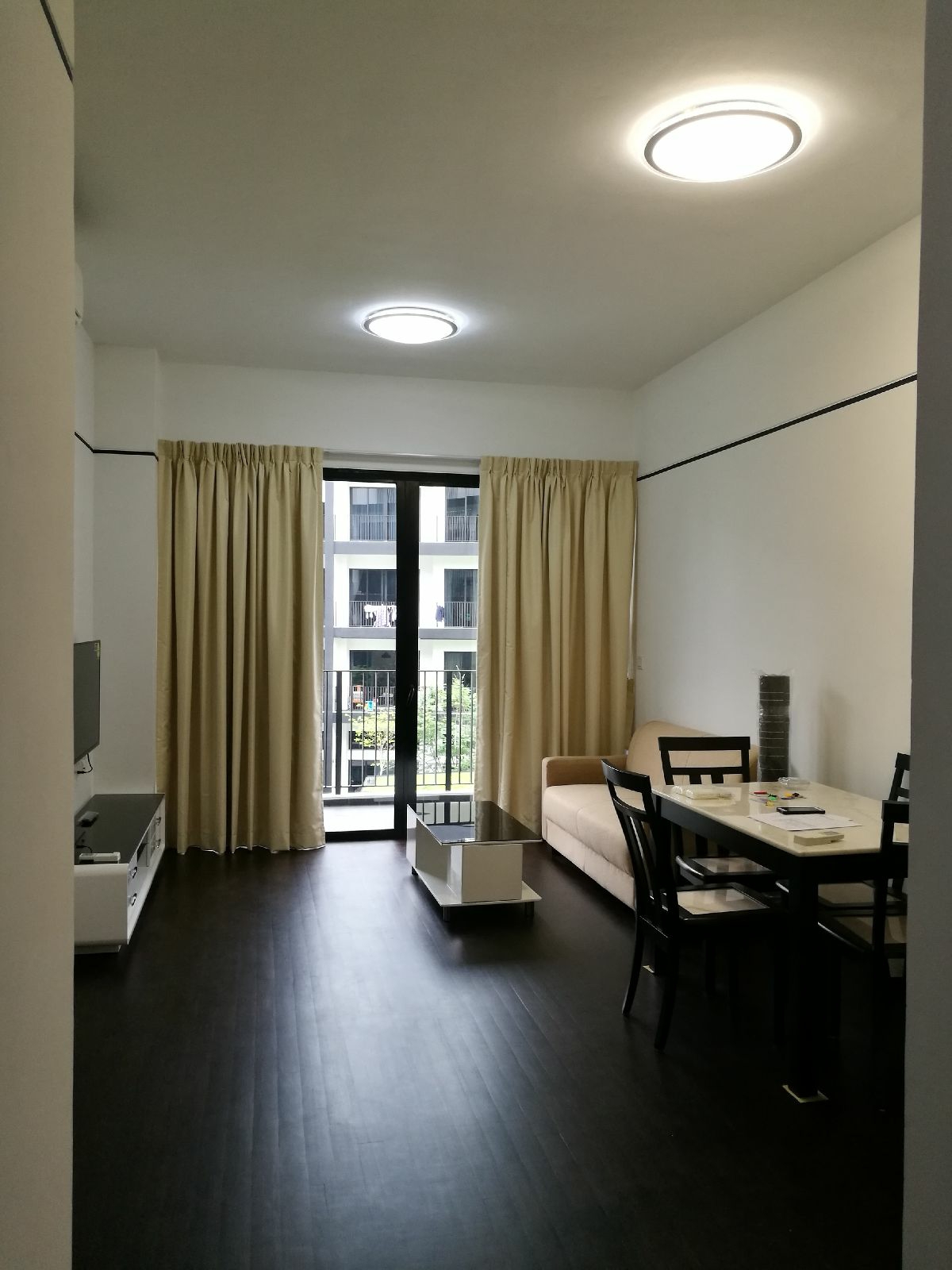 Step into a sanctuary of modern minimalism where natural light dances across the open-concept living and dining area, accentuating the sleek lines and stylish finishes. The black feature wall in the bathroom adds a touch of sophistication, while the balcony invites you to enjoy serene views of lush greenery and neighboring buildings.