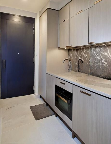 This efficient layout features a linear kitchen equipped with integrated appliances, a stylish marble backsplash, and light wood cabinetry that perfectly complements the sleek design. The bedroom boasts floor-to-ceiling windows and a built-in wardrobe, while the luxurious bathroom showcases a rain shower and a floating vanity, all adorned with high-end black fixtures. Every detail has been thoughtfully curated to create a sophisticated living experience.