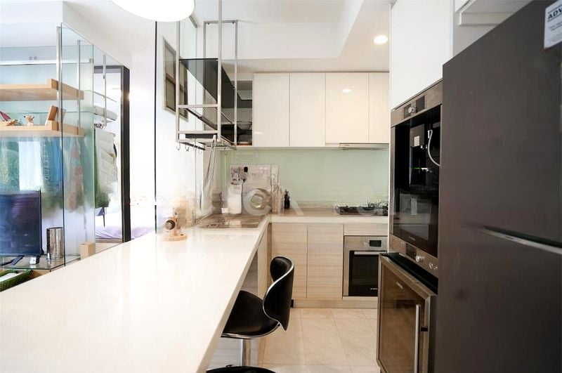 This well-maintained 1-bedroom unit features a compact yet efficient layout, complete with a stylish kitchen boasting white quartz countertops, a built-in oven, and a breakfast bar that invites casual dining. The bedroom is a cozy retreat, equipped with a wooden bed frame, full-length blackout curtains, and frosted glass wardrobe doors, ensuring both comfort and privacy.