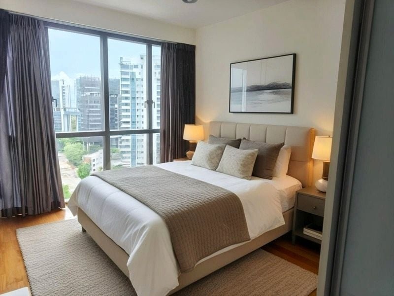 Step into a sanctuary of light and space at The Shore Residences, where abundant natural light floods the open-concept living area, accentuating the marble-look tile flooring and modern finishes. The glass-enclosed shelving unit and floor-to-ceiling curtains create an inviting ambiance, while the private balcony offers serene views of lush greenery, perfect for unwinding after a long day.