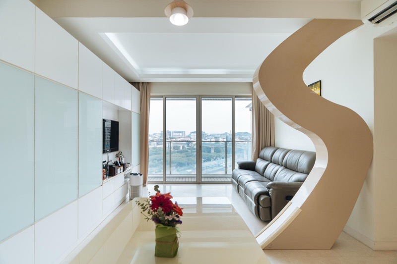 This thoughtfully designed unit features a master bedroom with a plush double bed and built-in floor-to-ceiling wardrobes, providing ample storage while maintaining a clean aesthetic. The integrated window desk with a dark stone top and wall-mounted shelving adds functionality and style. The common bedroom, equipped with a single bed and a dedicated study desk, is perfect for guests or as a home office, making this unit ideal for modern living.