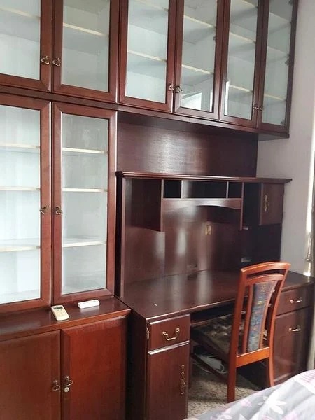 Step into this beautifully renovated unit and be greeted by the modern industrial ambiance that envelops you. The terrazzo flooring glistens under the natural light streaming through large windows, while the sliding glass doors invite you to enjoy the serene greenery and street views from your balcony. The fully-furnished living room, featuring a sleek built-in black TV console and a plush tan leather sofa, sets the perfect tone for relaxation and entertainment.