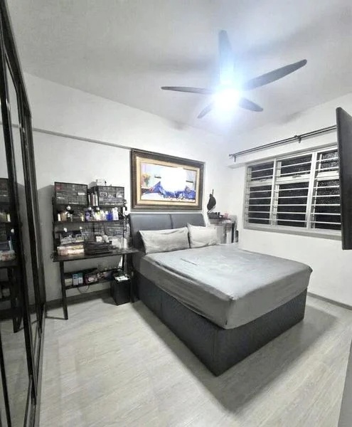 This thoughtfully designed 3-bedroom flat boasts a modern galley kitchen with striking two-tone cabinetry, perfect for culinary enthusiasts. The master bedroom features mirrored wardrobe doors and an integrated study area, while the second bedroom is adorned with playful pink accent walls and butterfly decals, making it ideal for children or guests. A dedicated multi-purpose room serves as a home gym and guest space, ensuring versatility for your lifestyle needs.