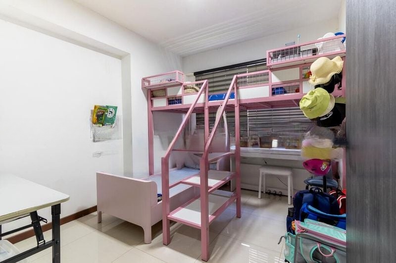 This unit boasts extensive built-in carpentry, including full-height wardrobes and a well-equipped kitchen with a built-in oven and gas hob. The glass-enclosed study room is ideal for work or leisure, while the kids' bedroom offers a playful yellow accent wall and ample play space. Enjoy the convenience of ceiling fans in every room and track lighting that enhances the contemporary feel throughout.