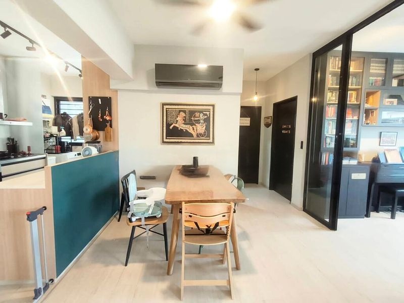 Step into this beautifully renovated 3-bedroom HDB flat and be greeted by an abundance of natural light streaming through large windows, illuminating the modern and functional design. The open-concept living and dining area features a stylish wooden TV console and a sleek glass partition leading to the study, creating an inviting ambiance perfect for relaxation and entertainment.