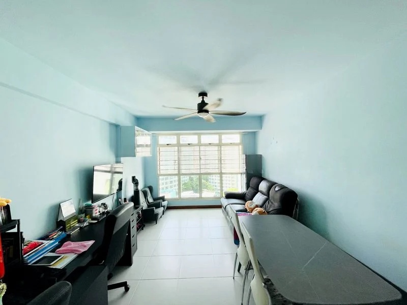 This well-maintained 3-bedroom flat boasts thoughtful renovations, including wood-look laminate flooring in all bedrooms and dedicated study areas that cater to modern living. Each bedroom is uniquely accented, with vibrant hues of green, pink, and purple, providing a personal touch. The service yard is equipped with overhead laundry drying poles and ample utility space, enhancing practicality for daily chores.